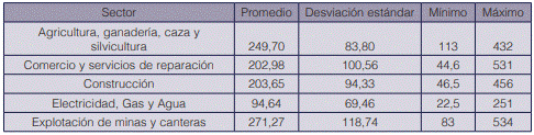 Cuadro 3 Promedio, desviación estándar y valores máximos y mínimos de los valores SIA final por sector industrial.