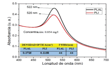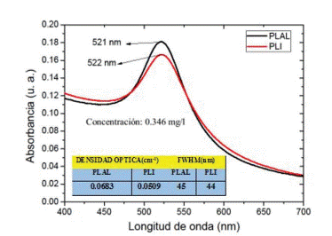 En la figura 5, se muestran los espectros de absorción de los coloides con NpsAu con concentración de 0.512 mg/l. Se observa un único máximo de absorción en la región visible del espectro electromagnético. Al comparar los espectros podemos observar que la variación en el ancho de la banda relacionada con el plasmón es de 2 nm. Respecto a la intensidad del espectro de absorción se observa que los coloides irradiados (PLI) presentan menor intensidad.