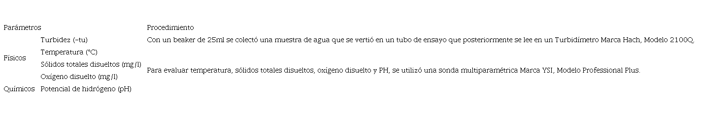 | Físicos | Turbidez (-tu) | Con un beaker de 25ml se colectó una muestra de agua que se vertió en un tubo de ensayo que posteriormente se lee en un Turbidímetro Marca Hach, Modelo 2100Q. |