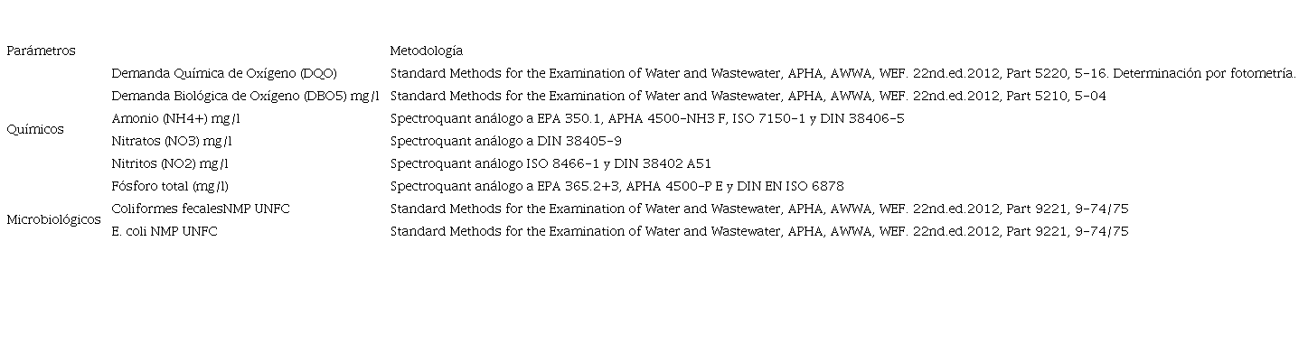 | Microbiológicos | Coliformes fecalesNMP UNFC | Standard Methods for the Examination of Water and Wastewater, APHA, AWWA, WEF. 22nd.ed.2012, Part 9221, 9-74/75 |