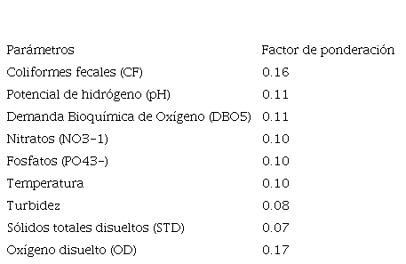 Se estimó el índice de calidad del agua correspondiente a cada una de las doce (12) estaciones de muestreo en forma bimensual durante el período de estudio, según la metodología del National Sanitation Foundation -NSF- de Los Estados Unidos de América, a través del sistema en línea desarrollado por Oram (12) denominado “Calculadora del Water Reserch Center”, el ICA-NSF utiliza un sistema de ponderación sobre los parámetros de estudio, cuadro 3.