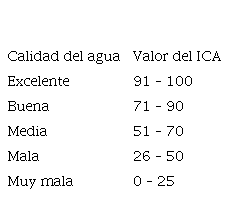 Los índices de la calidad del agua son herramientas que permiten la toma de decisiones para reducir el deterioro de la calidad del agua al evaluar de forma directa las variaciones de sus parámetros de calidad (3). Actualmente existen diferentes metodologías para determinar la calidad del agua, y estas poseen divergencias entre sí al determinar la calidad del agua, por lo que consideraciones profesionales son importantes al momento de interpretar la calidad del agua (8). La metodología del ICA-NSF es utilizada para determinar la calidad del agua de ríos para consumo humano, usando pesos ponderados en sus parámetros, lo que ha permitido que sea popularizado en muchos países (9).