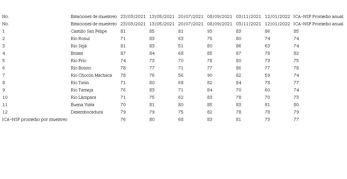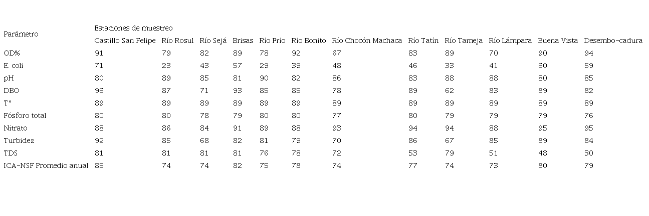Como puede observarse, el 81% de las estaciones de muestreo indicaron una calidad de agua “buena” destacándose los puntos Río Bonito y Desembocadura, los cuales mantuvieron esa categoría durante todo el período de evaluación, mientras que el 18% indicaron una calidad “media” principalmente Ríos Sejá, Río Chocón Machaca y Río Tameja que presentaron esta categoría en dos ocasiones y el 1% indicó una calidad de agua “excelente” en el punto Castillo San Felipe.