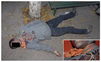 Varón de 36 años, con antecedente de consumo crónico de pasta base de cocaína e ideación suicida. El cadáver fue encontrado frente a su domicilio, sobre la vía pública, en decúbito supino, al lado de un banco y de un árbol mediano. Vestía ordenadamente, las ropas estaban indemnes.