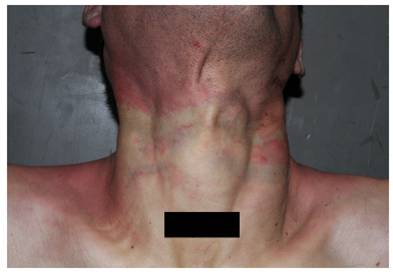 Figura 2: Examen externo del cuello. Zona cervical anterior donde se aprecia un surco equimóticoexcoriativo, ancho e irregular, con marcada
