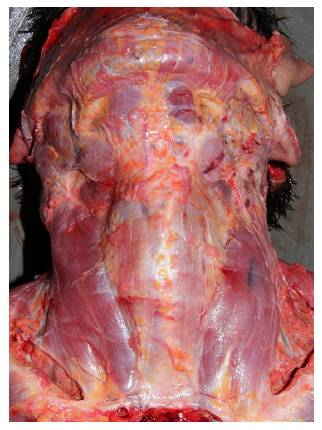 Al examen interno, la disección cervical reveló que la musculatura antero lateral cervical, el esqueleto laringo-hioideo y la glándula tiroides estaban indemnes (Figura 3). Solamente la lengua presentaba abundante hemorragia desde la punta hacia la base, al igual que los músculos del suelo de la boca (Figura 4).