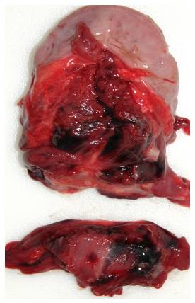 Figura 4: Lengua Cara ventral y segmento con áreas de hemorragia reciente.