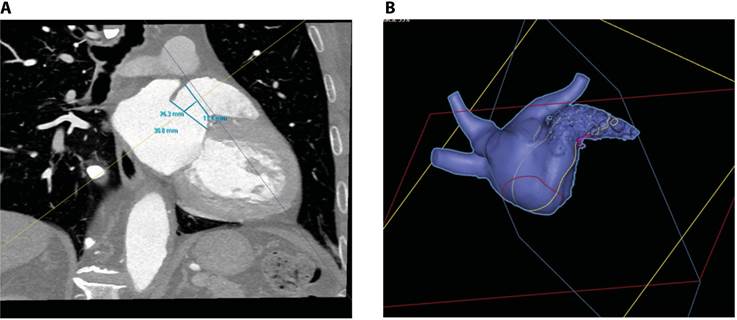 Figura 1. A. imagen de la TAC realizada al paciente para valorar tipo de dispositivo y evaluar la efectividad del procedimiento. B. muestra el uso de la TAC 3D Heart Navigator a valorar la morfología de la orejuela izquierda y localización de las venas pulmonares.