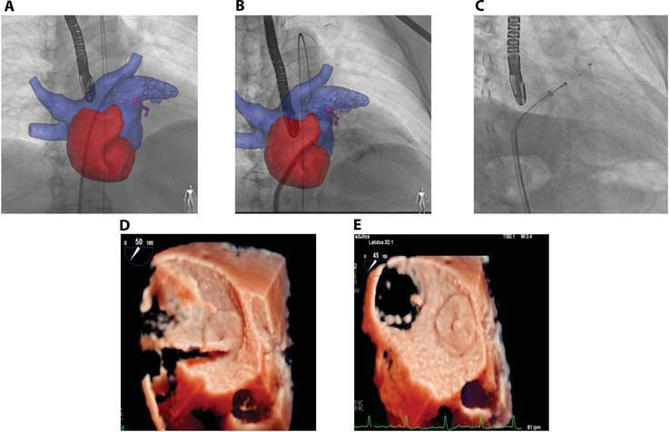 Figura 2 TAC con sistema Heart Navigator y acceso a vena pulmonar superior izquierda. A y B. proceso de liberación de dispositivo por cardiólogo intervencionista. D. imagen de ecocardiograma trans esofágico fotograma de adquisición volumétrica 3D modo zoom, con técnica de transiluminación enfocado en orejuela izquierda muestra el proceso de verificación, se observa adecuada posición de dispositivo amplatzer en ese momento no liberado, en la E. se muestra el resultado final del dispositivo liberado.