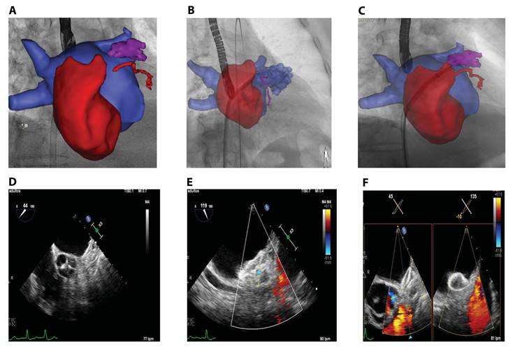 Figura 3 A y B. se observa mediante TAC con sistema Heart Navigator en sala de hemodinamia la morfología de la orejuela izquierda, la cual se encuentra más irregular y multilobulada. C. muestra colocación del dispositivo en la sala de hemodinamia. Figuras D, E y F. son fotogramas de ecocardiograma trans esofágico, 2D a nivel de esófago medio a diferentes grados donde se valora el resultado final de la adecuada colocación del dispositivo y no se observa flujo en la orejuela izquierda a la valoración del Doppler color.