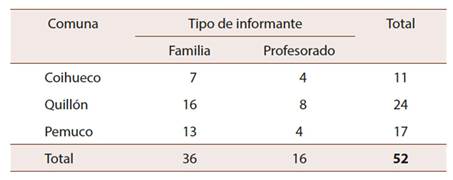 Se entrevistó un total de 36 personas apoderadas1, como representantes de las familias de los niños y las niñas y 16 docentes. La distribución del grupo de informantes se describe en la Tabla 1.