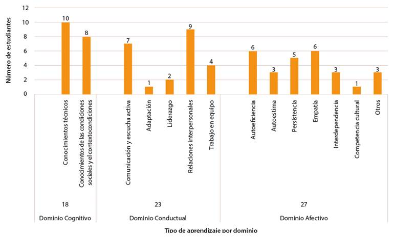 Las personas estudiantes mayoritariamente destacan los aprendizajes en el ámbito técnico (dominio cognitivo), luego los vinculados con las relaciones interpersonales (dominio conductual) y en tercer lugar los aprendizajes sobre condiciones sociales y el contexto (dominio cognitivo). Otros temas como comunicación, autoeficiencia, empatía, persistencia y trabajo en equipo, también fueron resaltados por el grupo estudiantil. Estos resultados son coincidentes con los de otros estudios sobre el tema.