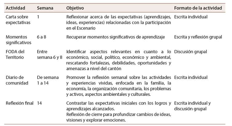 En el Escenario Comunidad y para promover aprendizajes basados en la experiencia y fortalecer la conciencia social de las personas estudiantes se trabajan diversas herramientas de reflexión a lo largo del cuatrimestre que facilitan estos procesos, las principales herramientas aplicadas durante el cuatrimestre se presentan en la Tabla 1.
