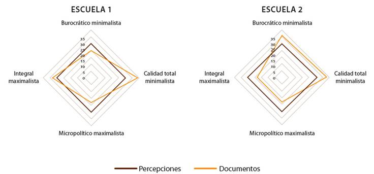 Coincidiendo con la escuela 1, los datos de la escuela 2 expresan la realización de prácticas guiadas por estándares impuestos: el conflicto como un elemento indeseable, una estructura organizacional con un poder vertical y una ciudadanía que no se vive. La media más baja de la escuela 2 pertenece al enfoque burocrático-minimalista, y el mayor valor de la media pertenece al enfoque de calidad total-minimalista. Diferencia que se puede interpretar como una transformación en la forma de gestionar la escuela; sin embargo, es una mantención de la formación ciudadana minimalista. Esto presenta un tránsito de formas de relacionarse desde lógicas empresariales rígidas hacia una convivencia más humana basada en estándares de conducta.