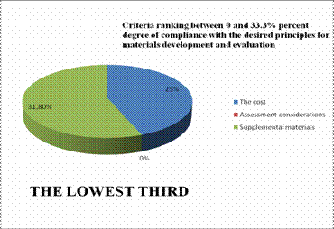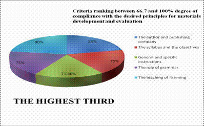 For the purpose of clarity, the researchers have resolved to group data into three categories operationalized as follows: The highest third, which depicts criteria ranking between 66.7 and 100% degree of compliance with the desired principles for materials development and evaluation, includes an analysis of the author and the publishing company, the syllabus and the objectives, general and specific instructions, and the role of grammar; the middle third, which describes criteria ranking between 33.4 and 66.6%; , includes an analysis of the layout, the setting, the target audience, methodological considerations, the teaching of culture, and critical thinking; and the lowest third, which displays criteria ranking between 0 and 33.3% percent, provides an analysis of the cost, assessment considerations, and supplementary materials.