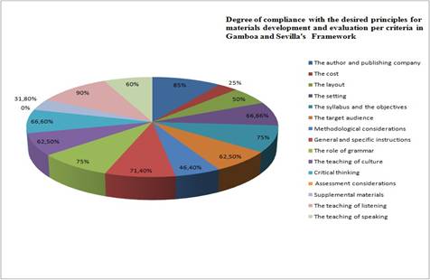 For purposes of tabulation and statistic practicality in the first stage of the data analysis, the degree of compliance was ranked as: Yes (= 2 points), No (= 0 points), and Partly (1 point). This allowed giving a raw score from 1 to 100 to each of the categories inquired which made it easy to conduct further discussion of the results. As for the second stage, a section for comments and recommendations was included at the end of every category so as to back up the numerical data with qualitative information that would allow a more balanced analysis of the overall degree of compliance of the book with the theoretical principles discussed in the review of the literature.