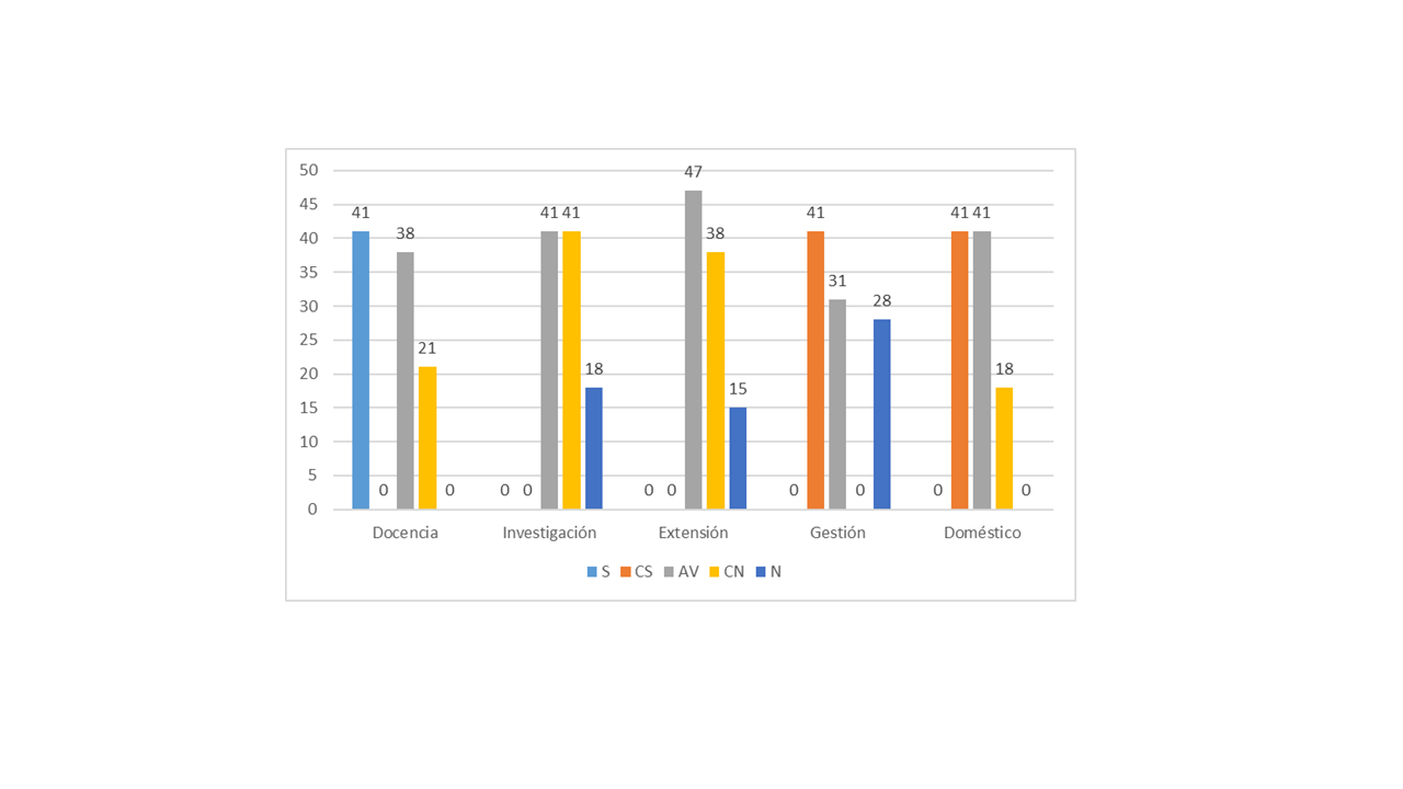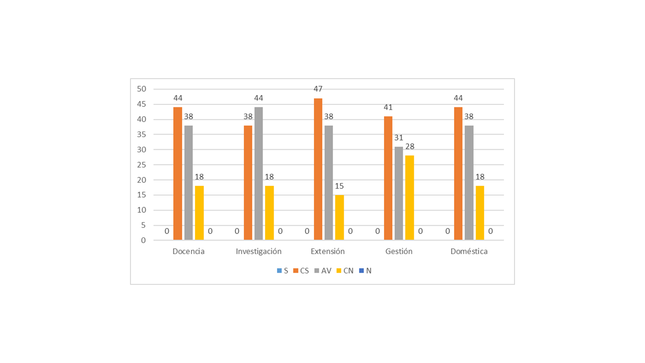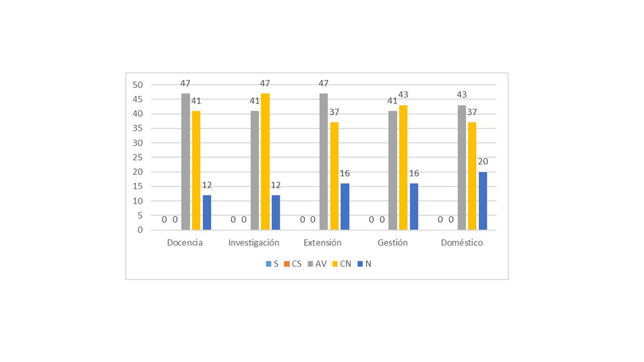 Los resultados en el cuestionario aplicado al personal docente arrojan actitudes desfavorables hacia la actividad laboral principalmente en las madres docentes universitarias dado que la gran mayoría de las profesionales muestran actitudes moderadas y bajas frente a la actividad laboral. Esta tendencia es corroborada en las investigaciones de Rimbau-Gilabert (2020) y González Moreno y Cuenca Piqueras (2020) al destacar la fuerte presión y responsabilidad durante y después de la crisis sanitaria el ejercicio de las funciones sustantivas de la actividad laboral dentro de la organización, así como también dentro de las actividades del hogar y grupo familiar donde confluyen y ejercen ambas labores.