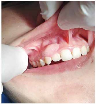 Al realizar el examen intraoral se observa un aumento de volumen de forma ovalada que va desde el margen gingival, abarcando encía adherida hasta muy cerca del fondo de vestíbulo. Esta lesión se extiende desde distal del diente 1.1 hasta mesial del 1.4. A la palpación, su consistencia es muy firme y tiene un color rosa pálido y presenta una base pediculada (Figura 1 y 2).