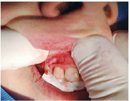 Se realizó una biopsia excisional de la lesión bajo anestesia local con vasoconstrictor. Al momento de retirar la lesión y realizar la biopsia, se observó una zona de exostosis ósea bajo la lesión, que se retiró en el momento de la cirugía (Figura 5).
