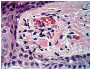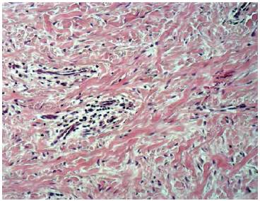 En la figura 6 se observa el conjuntivo con abundantes fibras colágenas desordenadas, algunos capilares, y algunas zonas de infiltrado inflamatorio en la zona superior.