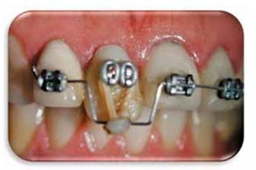 Se coloca una corona temporal de policarboxilato y se cementa.Se colocan brackets y un alambre de nitinol con un doblés a nivel de 1.1 para realizar tracción. (Figura 9)