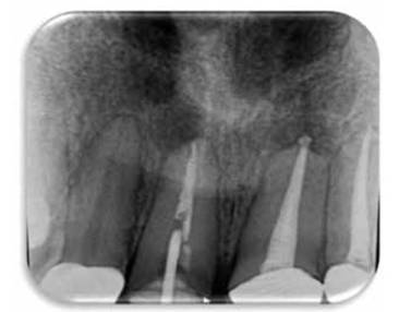 Paciente masculino de 36 años de edad sin antecedentes patológicos personales (A.P.P.) se presenta al Postgrado de Endodoncia de la Universidad Latina de Costa Rica por motivo de Trauma Dental debido un accidente laboral, el hecho ocurrió tres días anterior a su visita al centro de atención. Clínicamente se observa inflamación y un grado de movilidad II. Desalojo incisal y fuera de oclusión. (Figur 3) Radiográficamente se observa una obturación deficiente del conducto y a la vez una aparente fractura radicular. (Figura 4)