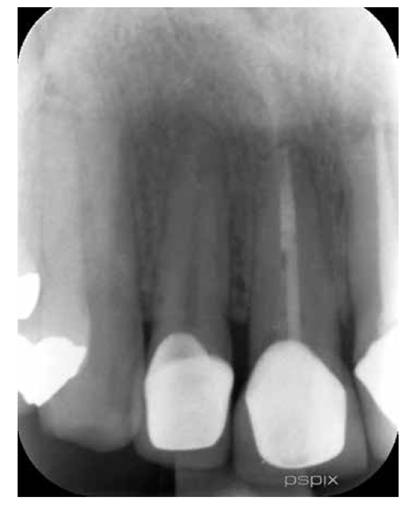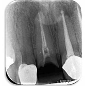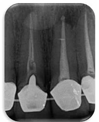Al paciente se le deja la pieza ferulizada con el mismo alambre de ortodoncia y con los brackets por unos tres a cinco meses con la finalidad de evitar una nueva recidiva. Posteriormente se remueve la ortodoncia y se procede a efectuar la rehabilitación del central superior derecho. Se cementa un poste de fibra de vidrio en el conducto radicular y se confecciona un muñón (con el material Duo Core) el cual finalmente es preparado para recibir una corona de metal porcelana y se le toma una radiografía periapical final. (Figuras 15A y 15B)