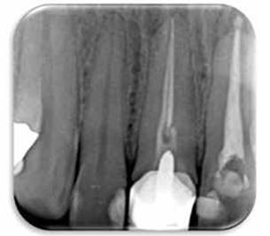 Figura 5B: Remoción de corona Vista Radiográficamente,nótese la lesión periapical que tiene la pieza y el mal sellado del conducto.
