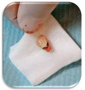 Figura 5C: Porción coronal removida,obsérvese el fragmento radicular adherido a la corona.