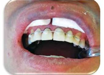 Se reposiciona y se coloca una férula con alambre de ortodoncia de 0.7 mm de grosor, se utiliza resina, ácido y adhesivo especial para porcelana (silano) debido a que se estaba trabajando sobre coronas de dicho material. Y se deja durante 15 días para estabilizar los tejidos suaves y planear el tratamiento. (Figura 6)