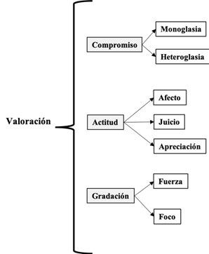 En la valoración del sistema de significaciones sobre la noción del sufrimiento, la Cosmovisión Indígena Bribri revela constantes sobre las instancias valorativas inscritas y evocadas de la «intersubjetividad en el discurso, considerando de manera conjunta la expresión de significados epistémicos e interpersonales» (Oteiza y Pinuer 2019, 213). Se analizaron los textos a partir de los subsistemas de valoración de: actitud, gradación y compromiso; del Modelo de Valoración de Martin y White (2005), el cual se puede observar en la Figura 1: