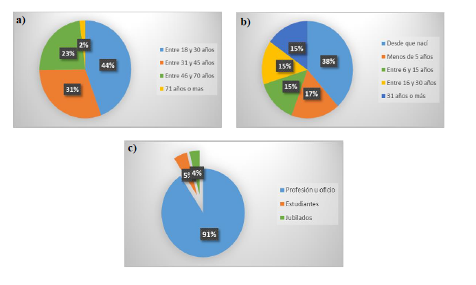 Figura 2 Perfil del residente encuestado: a) edad, b) tiempo de residencia, c) ocupación