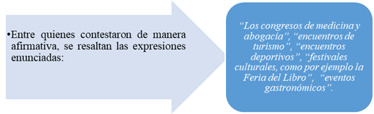 Con respecto a la percepción sobre el turismo de reuniones en la ciudad de Mar del Plata, primeramente, se consultó a las personas residentes sobre el conocimiento que poseen sobre esta modalidad turística. En tal sentido, el 66% de encuestados afirma tener conocimiento sobre el desarrollo de dicha modalidad, mientras que el 34% restante sostuvo no conocerla. Entre quienes han contestado afirmativamente, es importante resaltar a continuación algunas respuestas que aluden a expresiones significativas sobre el desarrollo de la actividad (Figura 3).