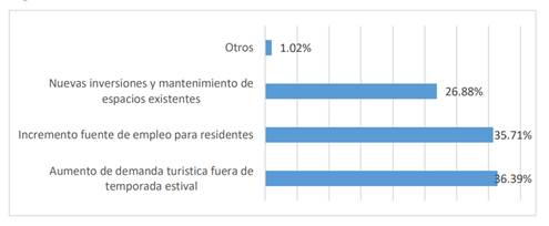Por otro lado, en cuanto a los beneficios que proporciona el turismo de reuniones (véase Figura 6), los mayoritariamente percibidos por los residentes son los siguientes: el aumento de la demanda turística fuera de la temporada estival (36,39%); el incremento de la fuente de empleo para residentes (35,71%); la generación de nuevas inversiones y el mantenimiento de los espacios ya existentes (26,88%) y en la categoría «otros» (1,02%) incluyeron «la promoción de la ciudad»; «la existencia de centros culturales» y «el desarrollo de un plan de gestión de turismo de reuniones» (De Simón 2021).