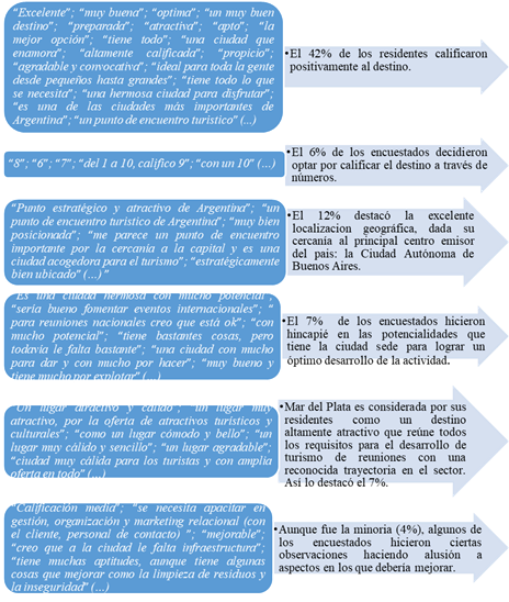 Se puede concluir que, según la percepción de sus residentes, Mar del Plata es una ciudad sumamente valorada. Además de destacar el equipamiento turístico y la trayectoria en el desarrollo de turismo de reuniones, encuestados resaltaron la excelente localización estratégica, los atractivos turísticos y la oferta hotelera, entre otros aspectos. Sin embargo, y aunque fue la minoría (4%), residentes hicieron alusión en ciertos aspectos que la ciudad debería fortalecer para lograr posicionarse como un óptimo destino sede de eventos, por ejemplo, mejorar la limpieza de residuos e implementar medidas tendientes a reforzar la seguridad.