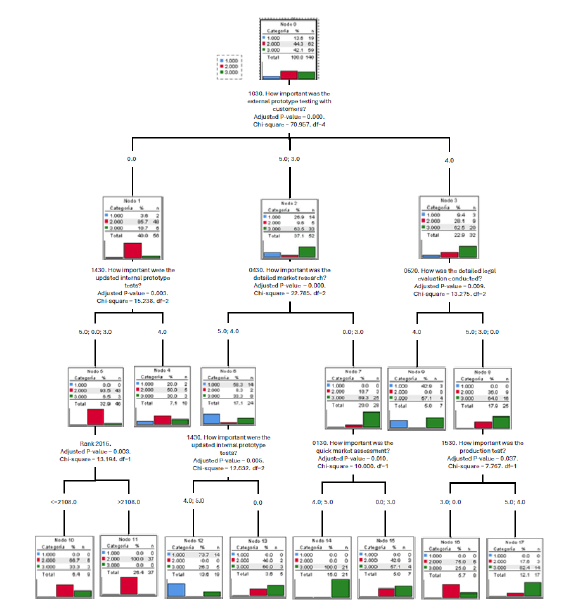Subsequently, once the cluster memberships were assigned, a tree regression analysis was carried out using the CHAID method. The results of this analysis, shown in Figure 1 helped determine the cluster profiles by characterizing them based on the observed results. The CHAID analysis revealed that the most important variable for classification was the importance of external prototype testing with customers. This partition revealed that a significant group of companies did not conduct prototype testing with customers, while others did so to varying extents. In cluster 2, 48 out of the 52 companies, did not perform these activities. Additionally, in this same cluster, it was observed that these companies are relatively small, as they ranked below the top 2000 in 2016. Another important characteristic of cluster 2 is that production testing was not relevant. Thus, it can be concluded that there is a low level of both market orientation and technical orientation in these companies.