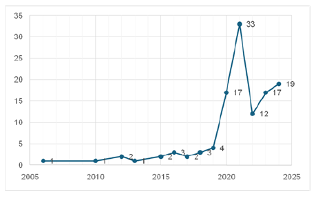 The literature on the intersection of these two topics has expanded since 2020, as we can see in Figure 1. Numbers show that 83% of research was published in the last 5 years. This indicates the growing interest among scholars.