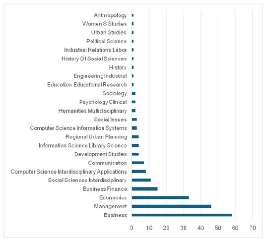 In Figure 3 we can see the classification of the publications by WoS categories. In WoS, articles can be classified into more than one category depending on the topic of the publication. For instance, the same article can be categorized at the same time as ‘Management’ and ‘Sociology’. That is why the total number of articles in Figure 3 does not sum 117, which is the total number of articles in our sample.