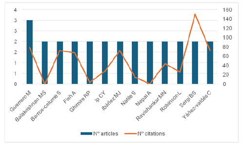 In Figure 4 we can see the main authors of the social entrepreneurship and digitalization intersection according to the number of contributions. There is a small difference by number of published articles, as the top contributor is Guerrero, M. with 4 articles, and all the rest follow with 3 publications. However, we find more differences by number of citations of each author. We can see that the most noticeable author is Sergi, B.S. with 150 citations; followed by Guerrero, M. with 78 citations; and Barros-celume, S., Ibáñez, M.J. and Yáñez-valdés, C. with 72 each.