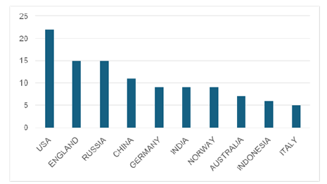 The United States of America (USA) emerges as the dominant leader, with over 20 publications, significantly outpacing all other countries. Following the USA, UK and Russia stand out with 15 publications each. This indicates that these countries are key players in shaping the theoretical and practical developments in this field. Emerging economies such as India and China also feature prominently, with each contributing around 10 publications.