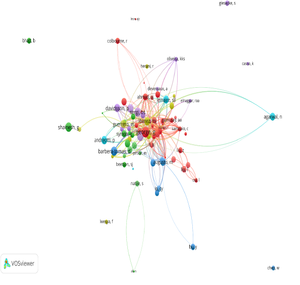 Regarding the colour clusters, we find 6 groups. The largest group is the red cluster, which comprises 69 authors. This group is densely connected with frequent internal collaboration compared to the other clusters that are more dispersed. The size of the nodes is related to the citations: the bigger the node, the more citations it has. The most notable author by number of citations in the red cluster is George, G. His work gathers 374 citations and addresses the topic of how to tackle climate change and sustainable development through digital entrepreneurship (George et al., 2021).