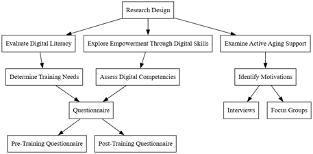 A case study approach is utilized, focusing on the Capacid@de Digital project, implemented in the county of Baião in the North of Portugal. This method enables an examination of the project's impact on digital Literacy and active aging within the community. This approach allows for an in-depth exploration of the phenomenon in a real-life context (Yin, 2018). This is particularly useful for understanding complex processes and interventions in a specific setting. The research design (illustrated in Figure 1) follows a mixed-methods approach, integrating quantitative surveys and qualitative interviews/focus groups to triangulate findings. Using a mixed-methods approach allows for a more comprehensive understanding of the research objectives by combining detailed data from participants, enhancing the validity and depth of the results (Creswell & Clark, 2017) .