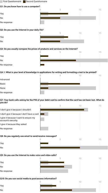Quantitative data was collected through pre- and post-training questionnaires. After completing the initial two modules (Introduction to Computers and Navigating the Internet) in four sessions, 12 participants completed a questionnaire in June 2023 to assess their acquired knowledge. The complete set of questions included in the instrument is provided in the Appendix of this paper. Although all participants initially completed the questionnaire before training began, only 12 responded to the same questionnaire after the fourth session, as some could not attend.