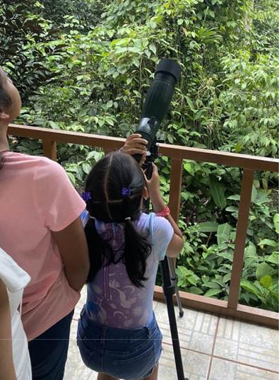 El taller de óptica, por su parte, adoptó una metodología basada en la indagación. Las participantes formularon preguntas tanto sobre la luz como sobre sus propiedades, y a través de experimentos y discusiones en grupo, construyeron respuestas basadas en la evidencia. Además, tuvieron la oportunidad de observar la fauna y flora local en la Reserva Biológica La Tirimbina, lo que les permitió integrar los conceptos científicos aprendidos con la práctica de la observación directa en la naturaleza.