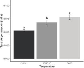 Las semillas empezaron a germinar al décimo día en los tratamientos de 20/30ºC y 30ºC, mientras que esto ocurrió cinco días después a 20ºC. No se detectó un efecto de la temperatura en el porcentaje acumulado final de germinación, pero sí en el tiempo medio de germinación (Tabla 1) y en la tasa de germinación (Fig. 1). Así, al incrementarse la temperatura, disminuyó el tiempo necesario para que el 50% de las semillas germinaran y aumentó el número de semillas germinadas por día.
