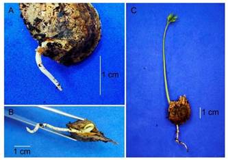 Fig. 2 Semilla de Myroxylon balsamum germinando dentro del fruto. A. Emergencia de la radícula; B. Elongación del epicótilo. C. Plántula en desarrollo.