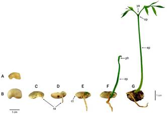 La germinación es hipogea y criptocotilar. Los cotiledones son blancuzcos y aumentan de volumen al absorber agua (Fig. 3A, B). En semillas incubadas a 30ºC, la radícula emerge a los 10 o 12 días (Fig. 3C, D). El epicótilo es fotosintético y se elonga rápidamente (Fig. 3E, F). No es posible observar el hipocótilo macroscópicamente.