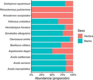 En la mayoría de las especies los individuos adultos fueron los de mayor abundancia (Tabla 1). En relación al tamaño corporal de los individuos atrapados, en las lagartijas hubo dos especies de categoría grande (B. vittatus y Holcosus undulatus), el resto presentaron talla mediana (Tabla 2). En serpientes, hubo dos especies de talla mediana y una de categoría pequeña. De las especies que presentaron individuos adultos, se les pudo determinar el sexo a 12 especies. De estas, la mayoría estuvo representada por individuos machos (Figura 1), a excepción de Rhinoclemmys pulcherrima y Kinosternon scorpioides que todos sus individuos fueron hembras. Solo en A. deppii hubo igual proporción de sexos (M:H= 1; no distinta de 1; X2= 0; p>0,05). Solamente en cuatro especies se pudo establecer la relación de tamaño corporal entre sexos. Se detectó que en Anolis macrophallus y en A. wellbornae los machos tuvieron mayor tamaño que las hembras (Tabla 3, Apéndice 3). Para el caso de A. serranoi y Sceloporus squamosus no se encontró diferencia de tamaño corporal entre los sexos.