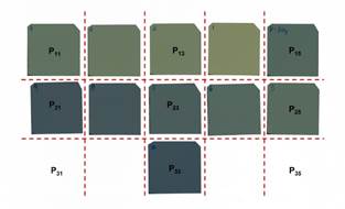 Las películas irradiadas que utilizamos para generar las curvas de calibración las colocamos sobre la pantalla del escáner en una configuración de matriz 3 x 5, donde cada posición la identificamos bajo la nomenclatura (PFila Columna). En esta configuración usamos las posiciones: P11, P13, P15, P21, P23, P25, P31, P33, P35 (Fig. 1), para colocar una película irradiada a 307 cGy, valor escogido arbitrariamente y que sustituyó a la película que se encontraba en dicha posición (por ejemplo, en la Fig. 1 se aprecia que la película de 307 cGy se encuentra en la posición P15, que correspondía a una dosis de 0 cGy), con el fin de determinar la variación de la dosis medida en la película por su cambio de su posición en el escáner. En cada una de estas posiciones escaneamos las películas, tomando una por cada resolución, para un total de 27 imágenes. En este proceso, las películas que no están identificadas bajo la nomenclatura mostrada en la Fig. 1, las mantuvimos en sus posiciones, esto para evaluar la variación en la dosis únicamente por múltiples escaneos en las 27 imágenes realizadas.