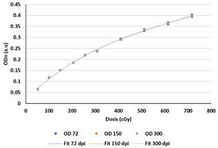 Determinamos la curva de calibración graficando ODn en función de la dosis en que fueron irradiadas las películas, y propusimos un ajuste polinomial (Shape & Miller, 2009). Al utilizar tres resoluciones en este proceso, obtuvimos las curvas para cada una de ellas. Además, comprobamos la normalidad de los residuos mediante el método Anderson-Darling.